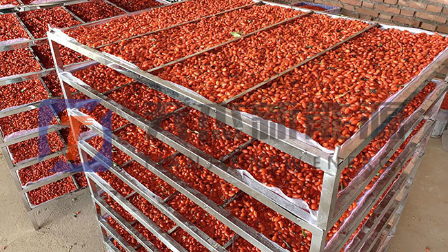 烘干枸杞的一階段是升速烘干階段。枸杞烘干機內(nèi)溫度上升到35℃-40℃,循環(huán)風(fēng)速2.3米/秒,溫度37℃-45℃。循環(huán)風(fēng)速1.3米/秒時,熱風(fēng)的傳遞和新鮮枸杞游離水分的擴散蒸發(fā)加快,尤其是枸杞皮層失水多達50%,表皮出現(xiàn)曲皺,新鮮枸杞內(nèi)含結(jié)構(gòu)水也從皮層氣孔開始慢慢滲出蒸發(fā),次期的升速脫水,枸杞內(nèi)糖分濃度增加,抑制了果內(nèi)成分的活性,保護了多糖、維生素、氨基酸等主要成分不被轉(zhuǎn)化或損失,尤其對紅色素保護好,烘干的果實色紅質(zhì)量高。