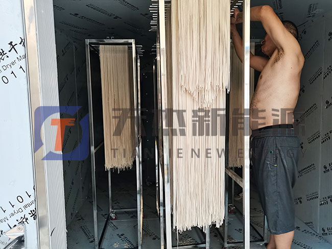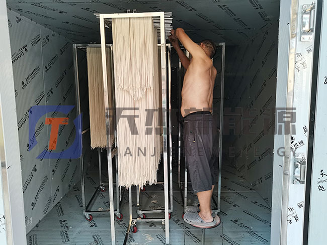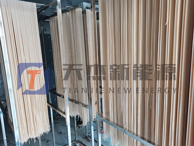 剛進入掛面烘干機內(nèi)的濕面條長度一般在1.4m左右,掛面烘干房若只采取高溫,又會加快表面汽化速度,因此空氣能掛面烘干機此時可升高溫度,下降濕度.