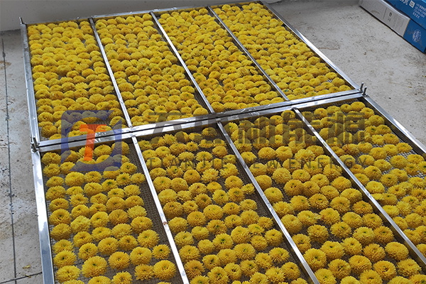 裝房過(guò)程中:將采摘好的菊花進(jìn)行挑揀,選擇花型一致,顏色統(tǒng)一的鮮菊花,均勻擺放在托盤(pán)上,如果對(duì)花型有要求嚴(yán)格的話,則建議在擺放時(shí)不要重疊,隨后放置在推車(chē)上,推進(jìn)菊花烘干機(jī)內(nèi)。