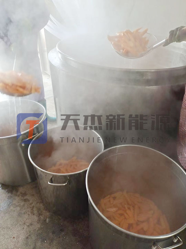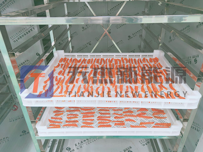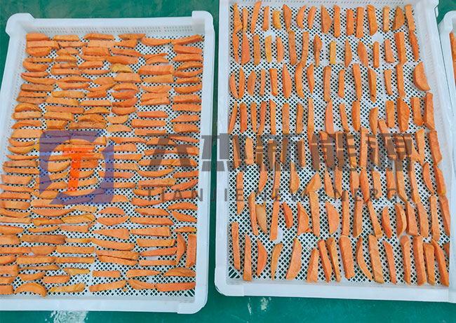 紅薯烘干工藝:紅薯烘干加工前需要先將紅薯去皮清洗,然后蒸煮。在有七八分熟的時候?qū)⑵淙〕?,冷卻,切片或切條、切丁。在切片環(huán)節(jié)中,要保持厚度一致差別別太大,將切好的紅薯均勻整齊的擺放在烘盤上。然后進行烘干。紅薯烘干機需要多久?請看下面介紹。