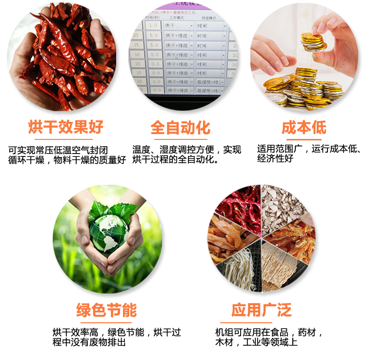熱泵烘干機(jī)烘干出來(lái)的物料效果好,可實(shí)現(xiàn)常壓低溫空氣封閉循環(huán)干燥,物料干燥的質(zhì)量好。全自動(dòng)化,烘干過(guò)程中的溫度濕度調(diào)控方便,實(shí)現(xiàn)烘干過(guò)程的全自動(dòng)化。一機(jī)多用,適用范圍廣,運(yùn)行成本低,經(jīng)濟(jì)性好。烘干過(guò)程中沒有廢物排出,綠色節(jié)能,烘干效率高。熱泵烘干機(jī)可應(yīng)用在食品,藥材,木材,工業(yè)等領(lǐng)域上。歡迎您聯(lián)系我們了解中藥材烘干機(jī)、辣椒烘干機(jī)、香菇烘干機(jī)、金銀花烘干機(jī)等更多產(chǎn)品。